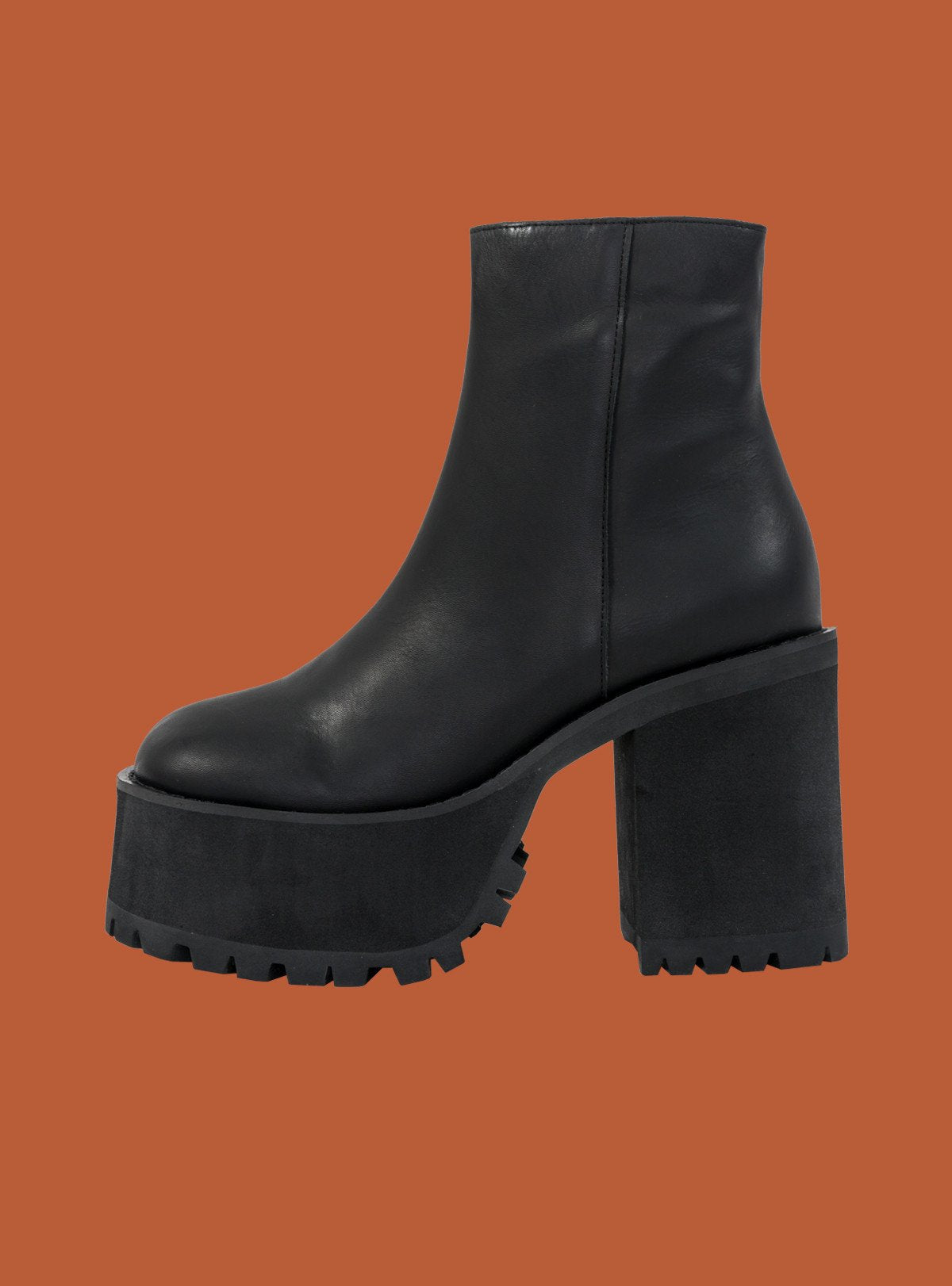 Leather Ankle boot features inside zipper with heavyweight branded pull, stacked dense foam platform with rubber sole.