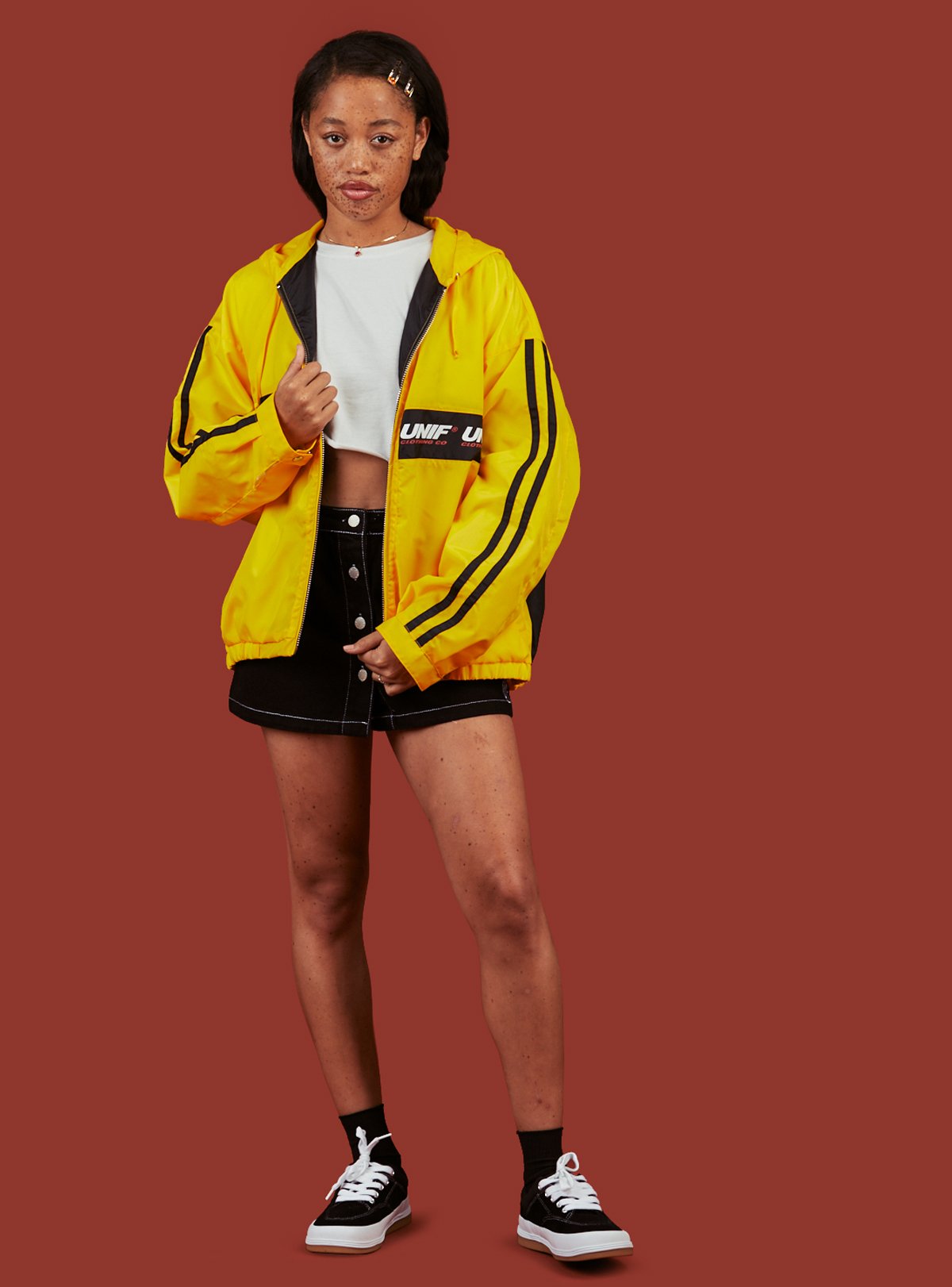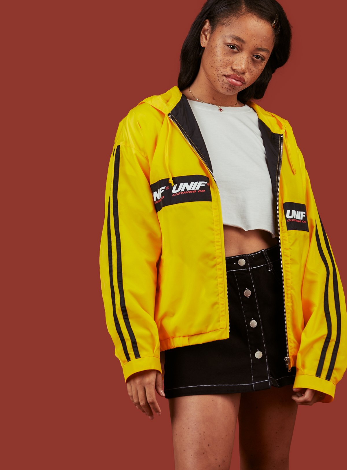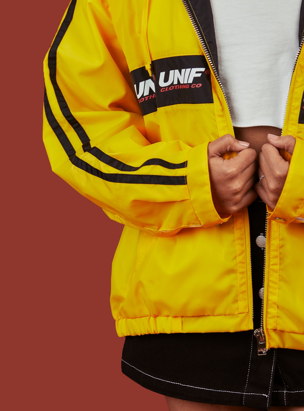 Hooded sportswear jacket with contrast applique striping on the sleeves and UNIF branding across the chest. Full zip front and drawstring at the hood. Fit is slightly oversized.