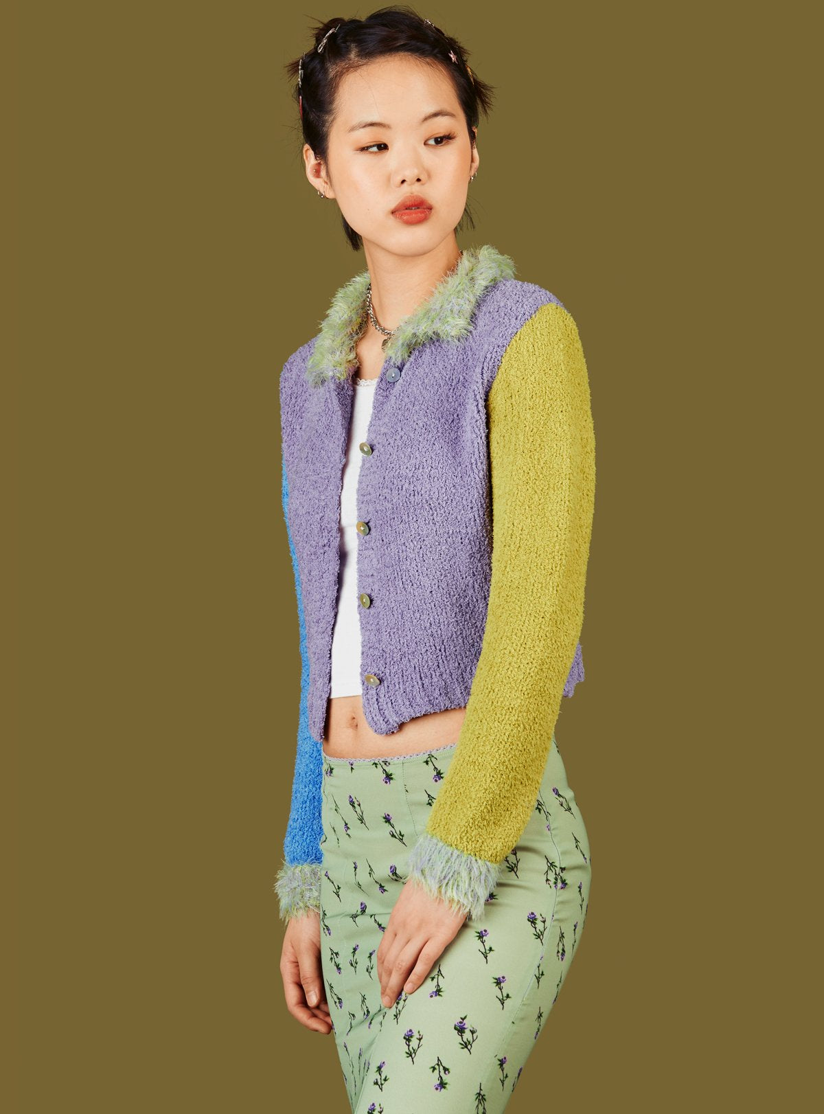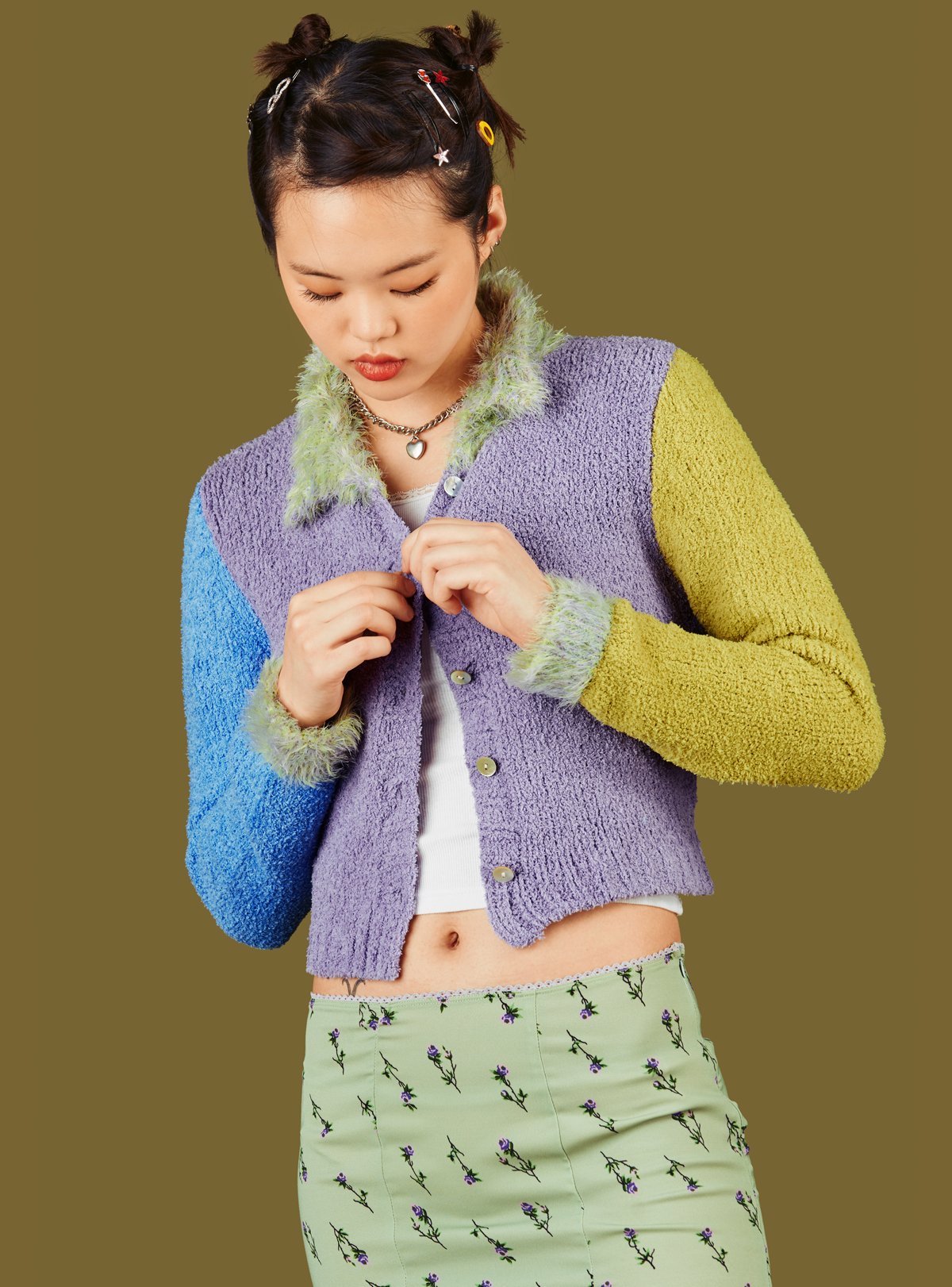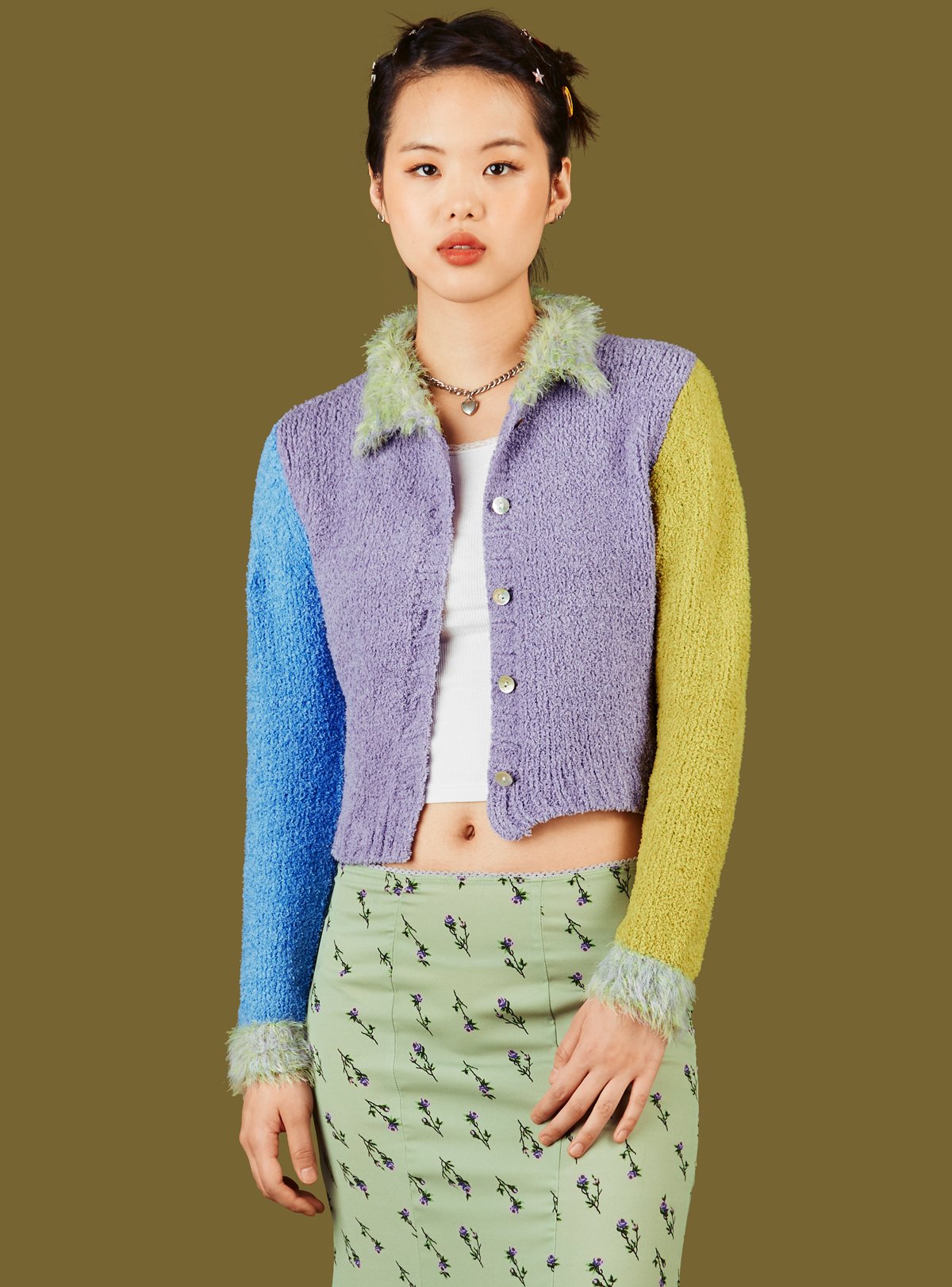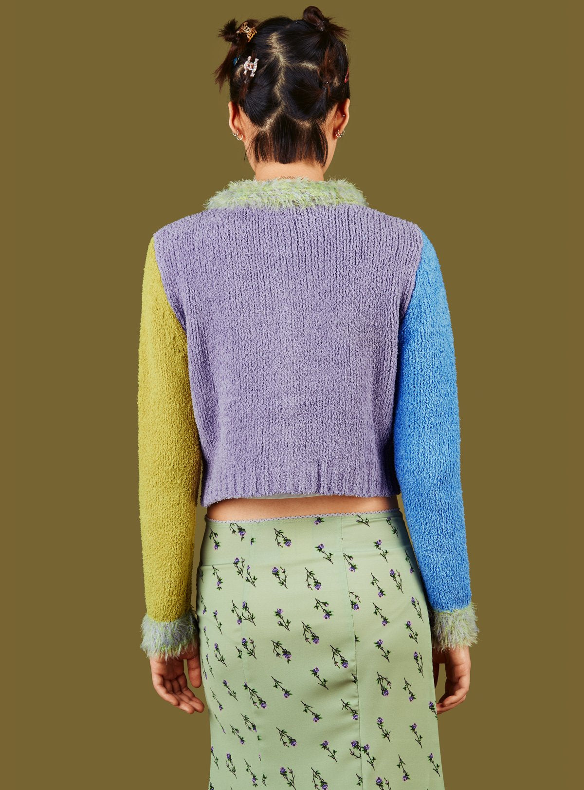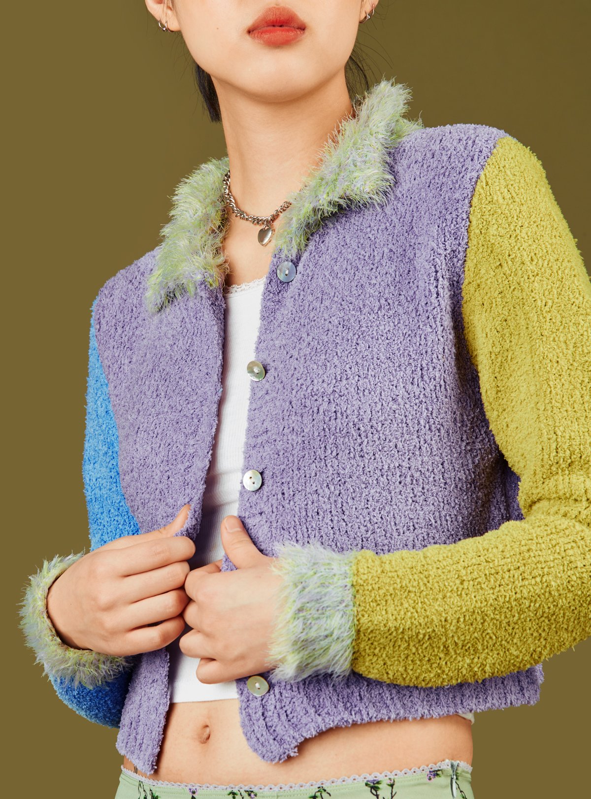 Beautiful panelled knit sweater with fuzzy collar and cuff details. Mother of pearl front button closure with a slightly cropped fit.