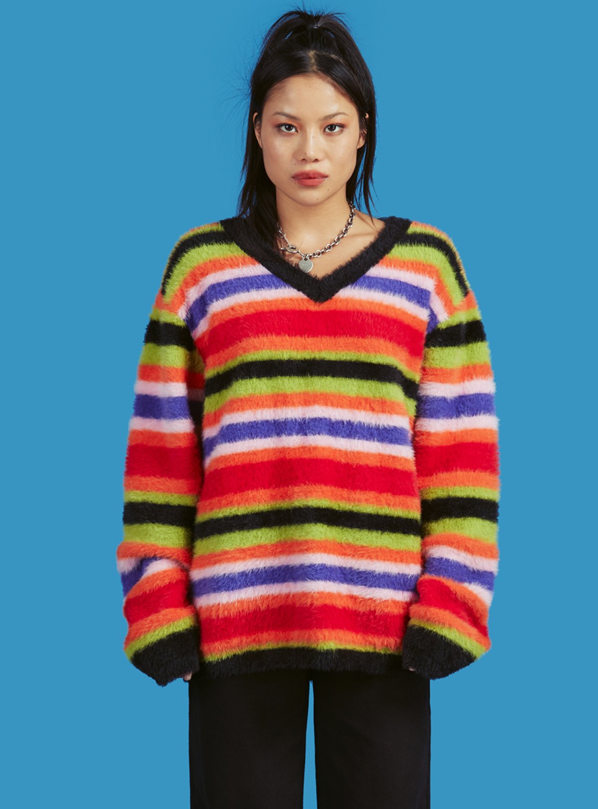Super oversized fuzzy striped sweater with a v neck, dropped shoulders and elongated sleeves. UNIF flag tag detail at side bottom hem.
